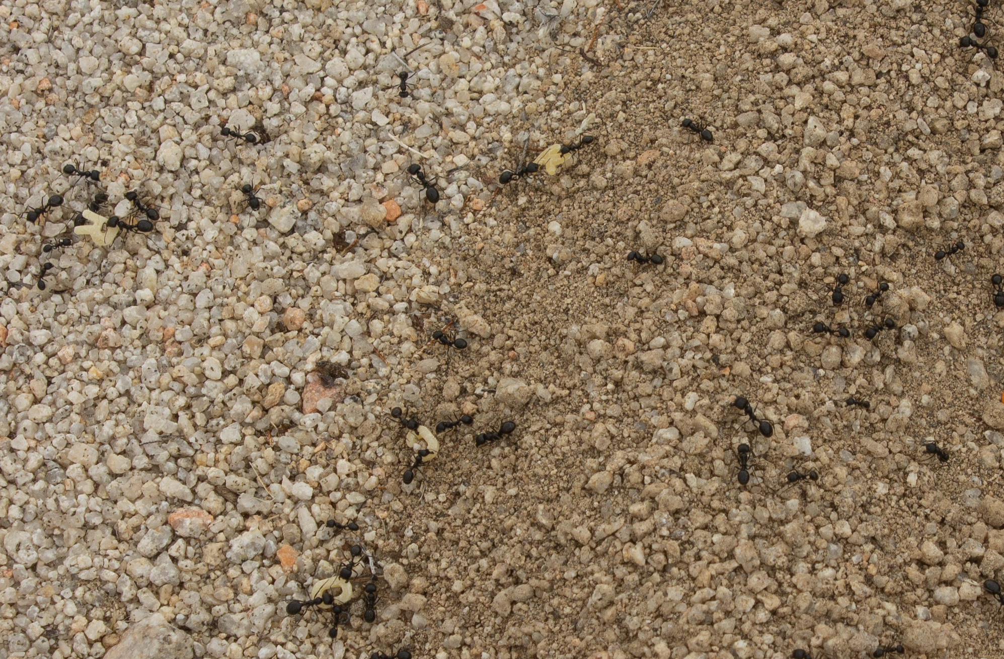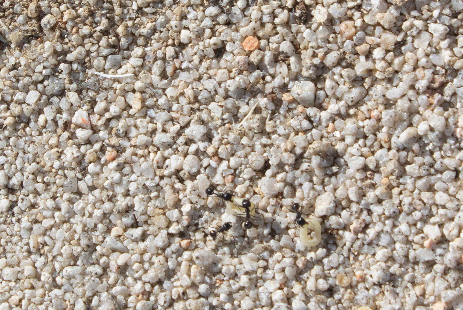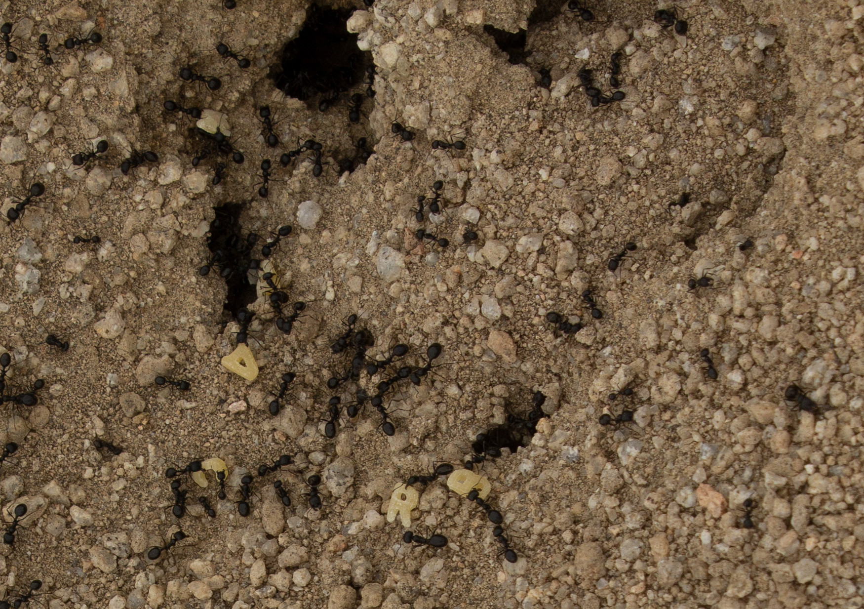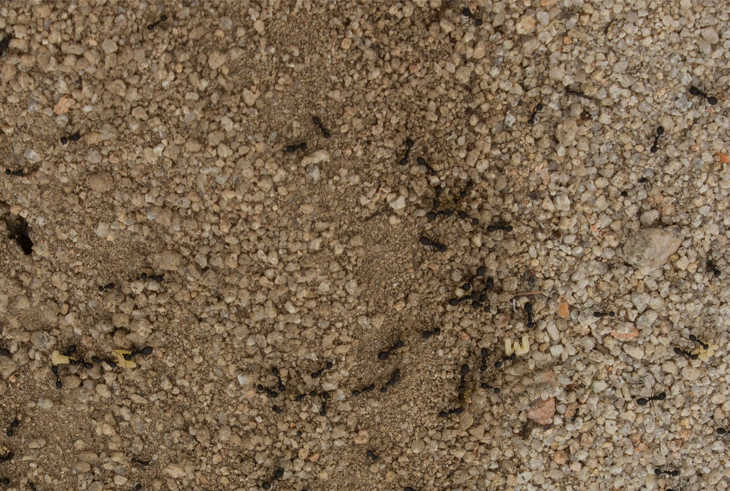 Feedings is a series of observations that capture the ants’ relationship to food and the artist’s relationship to language. After being given a pile of randomly selected letter-shaped pasta, the ants were documented moving the food back to their hills. As they moved, the ants spelled words. Instinct is interpreted as intention when the artist recognizes and personifies the order chosen by the ants.
