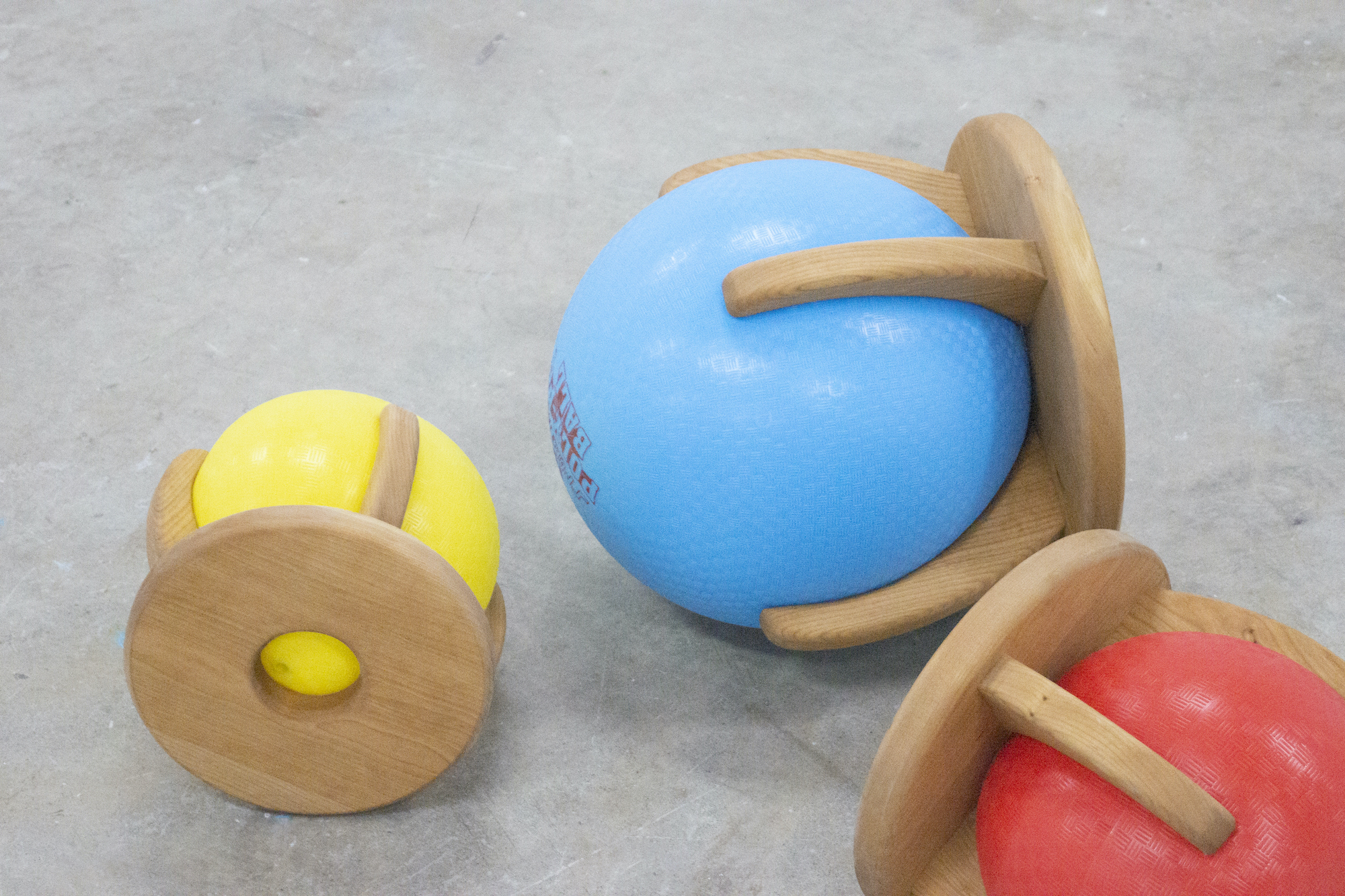Cherry, playground balls, and air. Sizes vary from 9-14 inches round.
